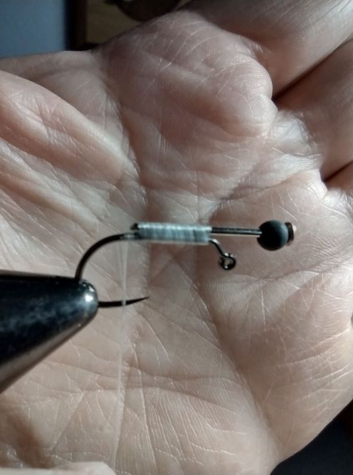 A pin with weighted bead is lashed to the shank with the head extending beyond the eye of the hook. The fly will be tied on the hook and pin so that the bead is pushed up against the head of the pin. The length of the extension needed is kind of trial and error, but the goal is to have the finished fly orient itself in a horizontal position when hung below a float or strike indicator (a.k.a. bobber).